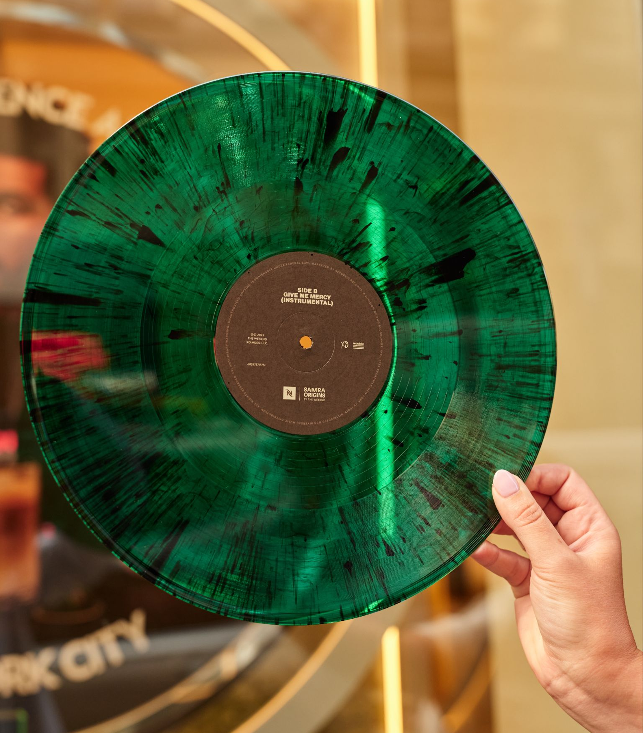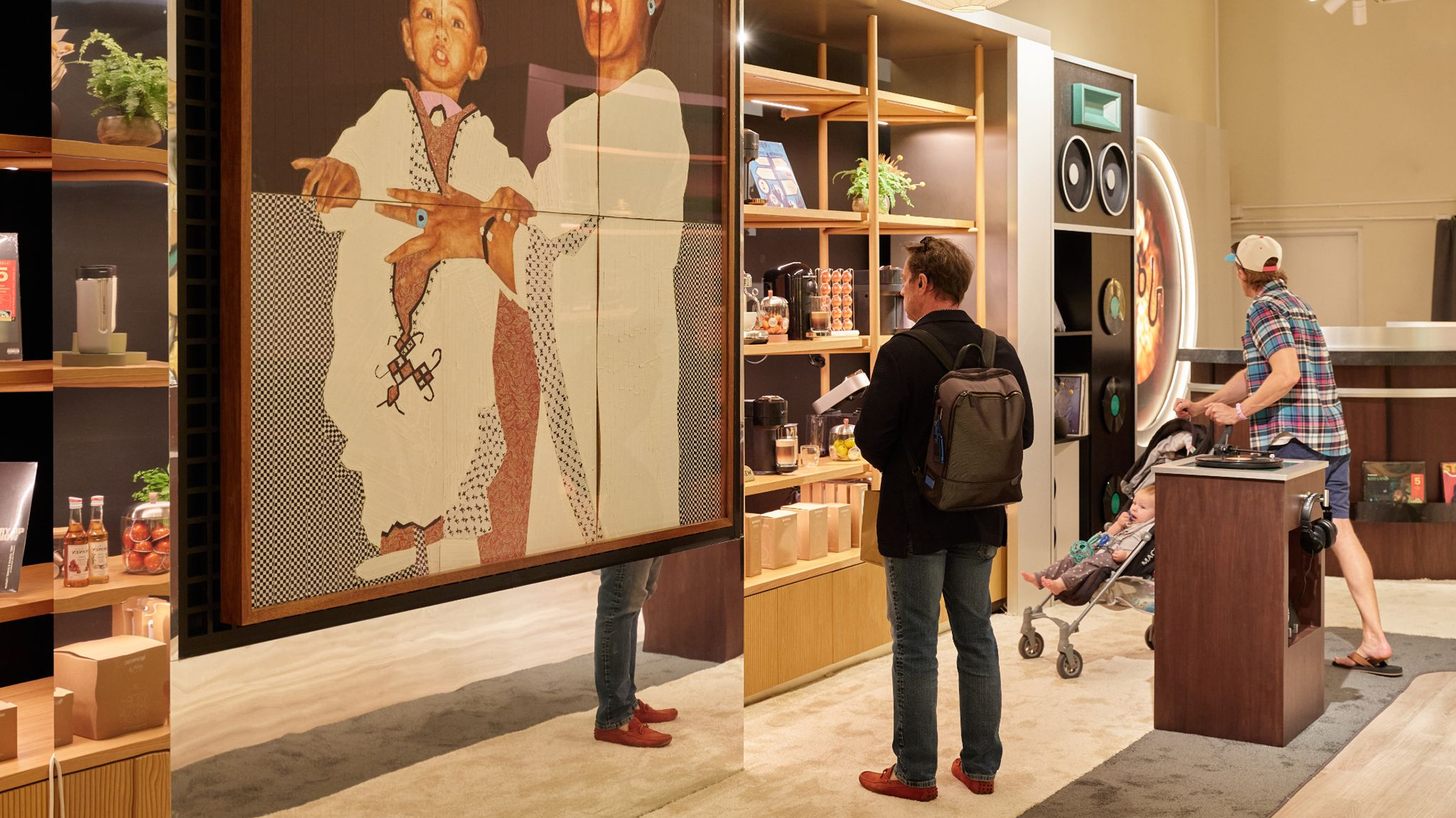 The space itself broke from traditional retail, introducing circular forms, soft archways, and intimate listening booths that echoed the shape and ritual of both records and coffee.